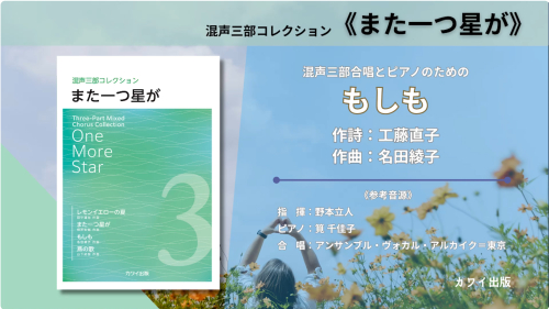 第1弾は根岸宏輔の神秘的なサウンドの新曲「また一つ星が(高橋元吉)」に、アップテンポの音楽が心躍る田中達也「レモンイエローの夏(みなづきみのり)」、豊かな旋律が広がる名田綾子「もしも(工藤直子)」、力強いメッセージが伝わる山下祐加「燕の歌(立原道造)」を収録。中高生に限らず大人世代も取り上げたい曲集となっている。全4曲。中級