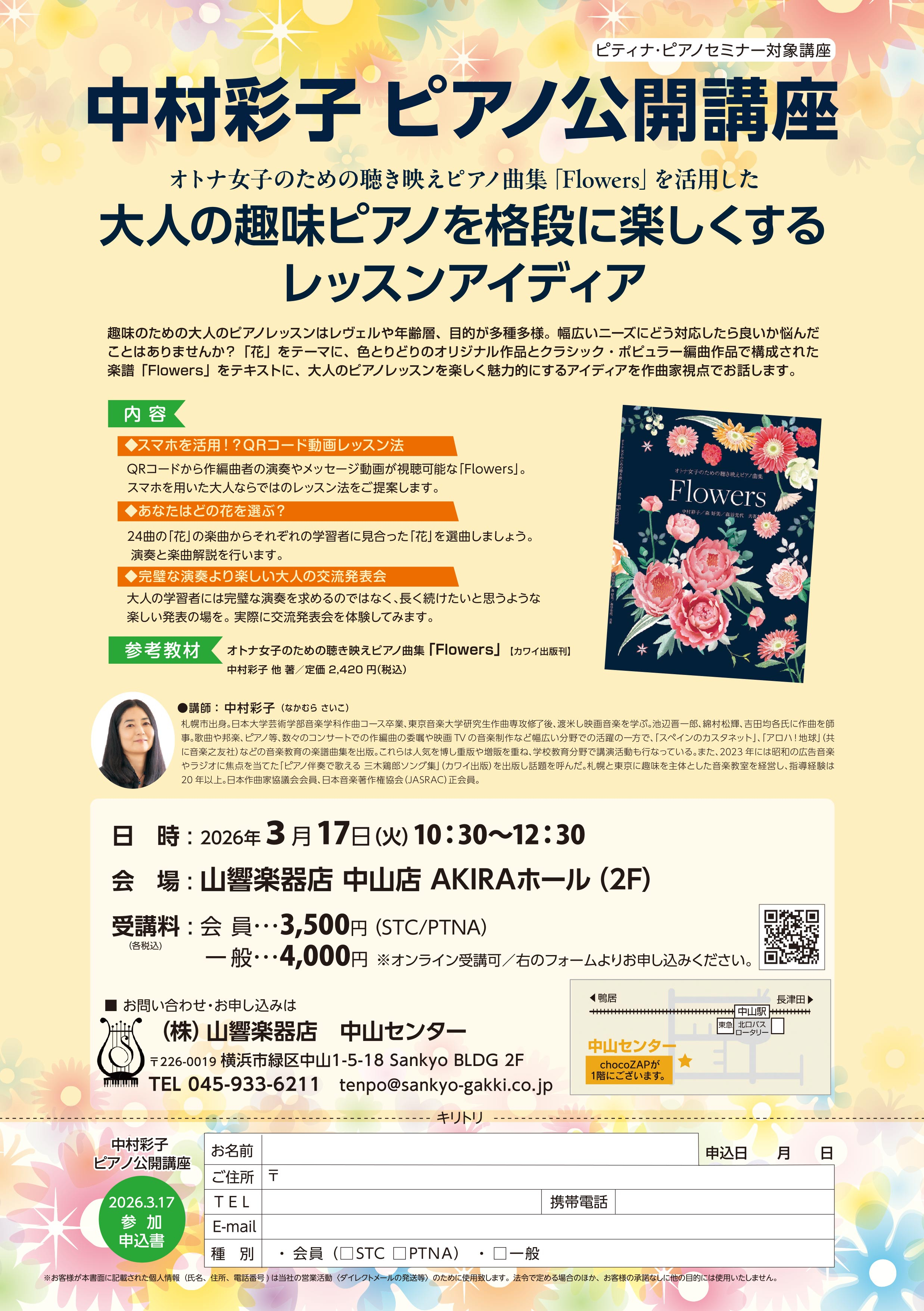 横浜市緑区の山響楽器中山センターで3/17に中村彩子さんのセミナーを開催いたします。