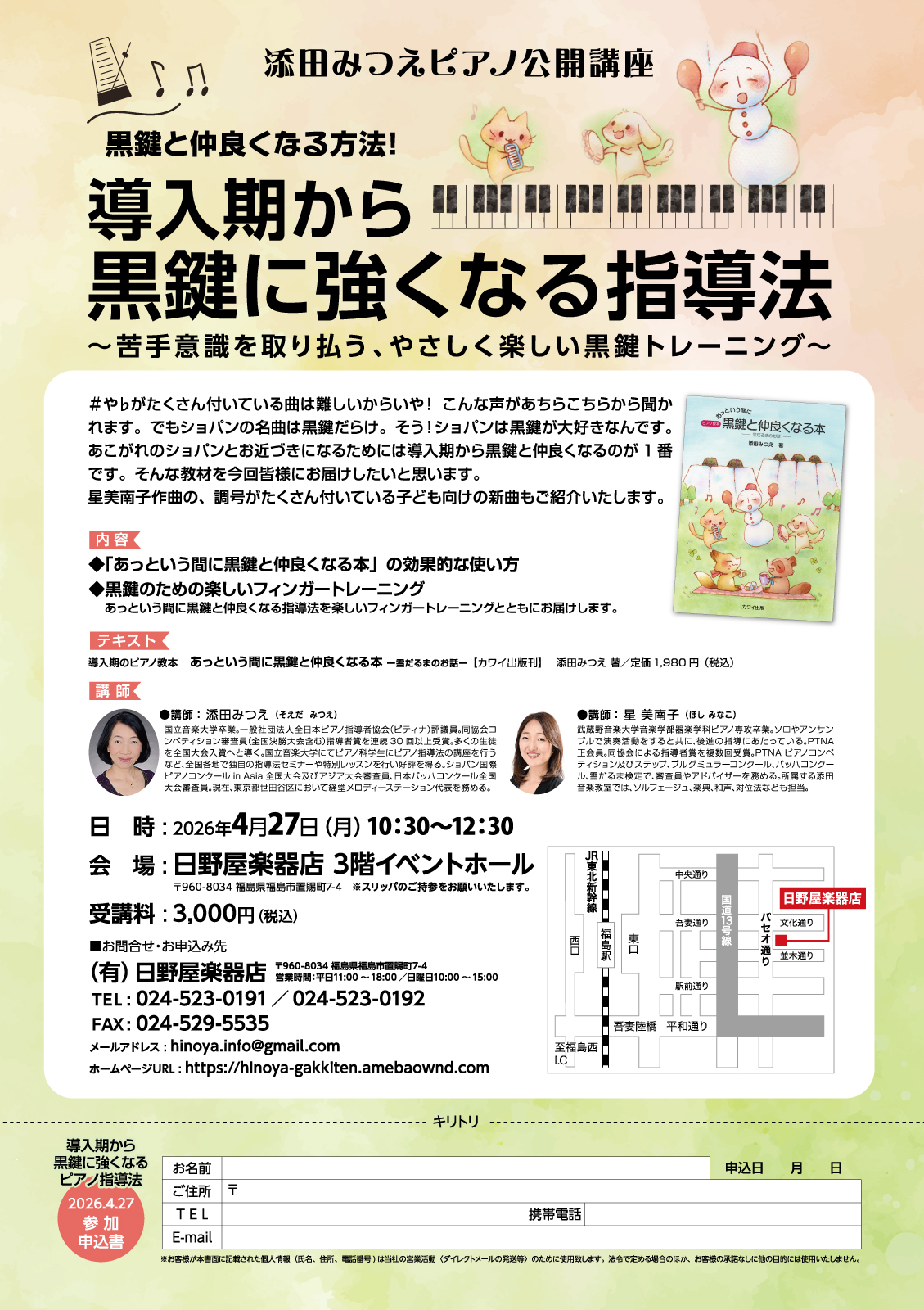 04/27添田みつえ:「黒鍵に強くなる指導法」セミナー(福島県福島市) 2026.04.01 セミナー 新刊「黒鍵と仲良くなる本」のセミナーを福島県福島市日野屋楽器店で開催いたします。ぜひ皆様ご来場ください。開催店日野屋楽器店ウェブサイト お知らせ一覧に戻る
