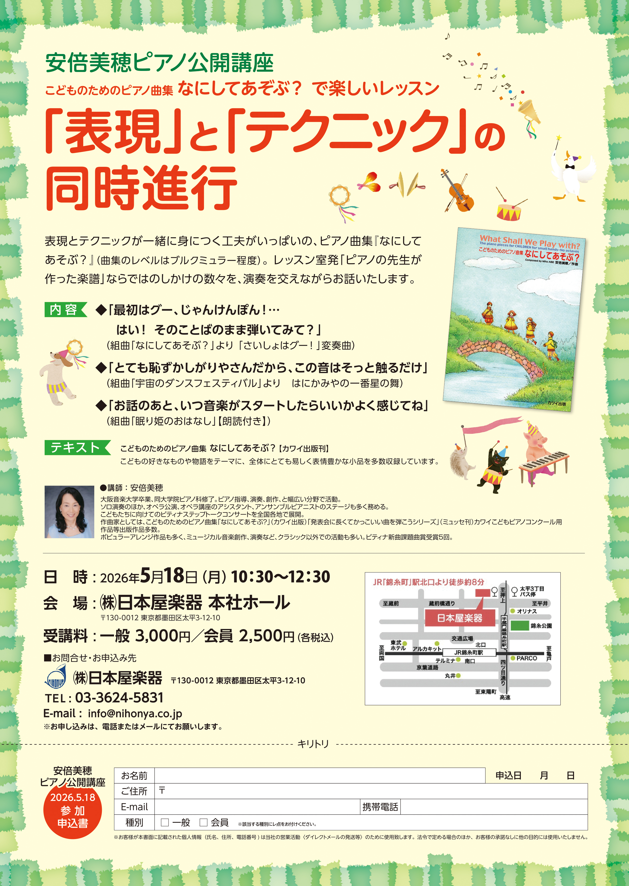 05/18 安倍美穂:「なにしてあそぶ?」セミナー(東京都墨田区) 2026.04.15 セミナー 安倍美穂さんのピアノ曲集「なにしてあそぶ?」をテキストにしたセミナーを錦糸町・日本屋楽器で開催いたします。ぜひ皆様ご来場ください。開催店日本屋楽器 お知らせ一覧に戻る
