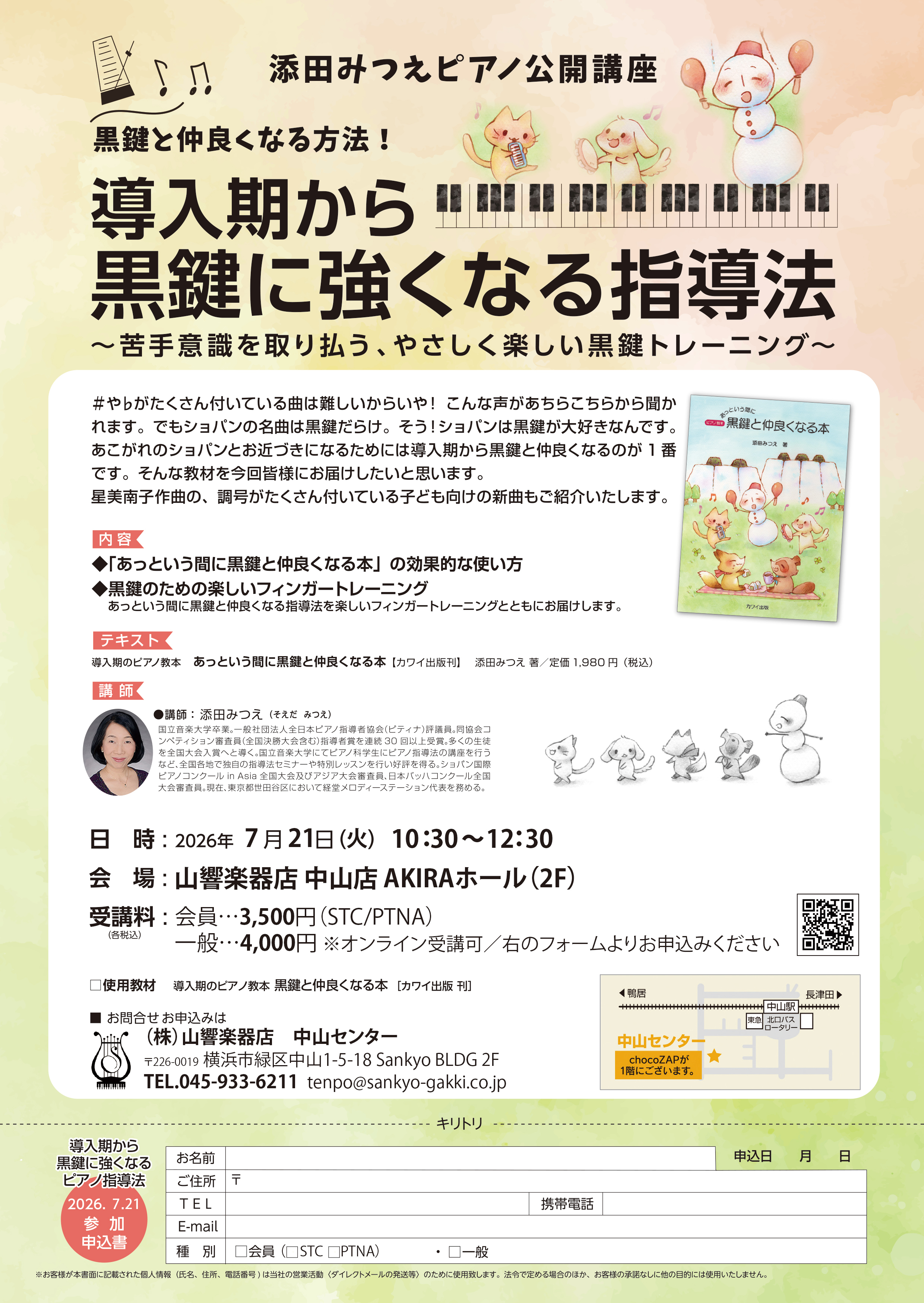 添田みつえさんのテキスト「あっという間に黒鍵と仲良くなる本」をテキストにしたセミナーを横浜市緑区・山響楽器中山センターで開催いたします。ぜひ皆様ご来場ください。